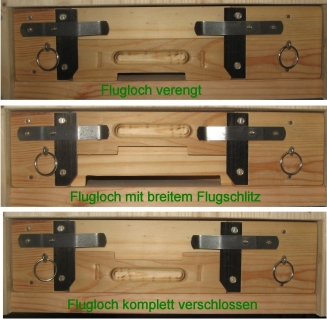 Wie aus den Abbildungen ersichtlich kann das Flugloch erweitert, eingeengt und gänzlich verschlossen werden, was bei in Gebrauch befindlichen Keilfluglöchern bisher nicht der Fall war.